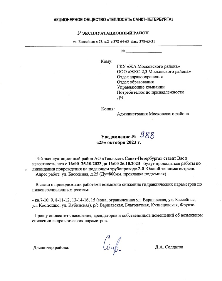 Третий эксплуатационный район АО "Теплосеть Санкт-Петербурга" ставит Вас в известность, с 16:00 25.10.2023 до 16:00 26.10.2023 будут проводиться работы по ликвидации повреждения на подающем трубопроводе 2-й Южной магистрали.