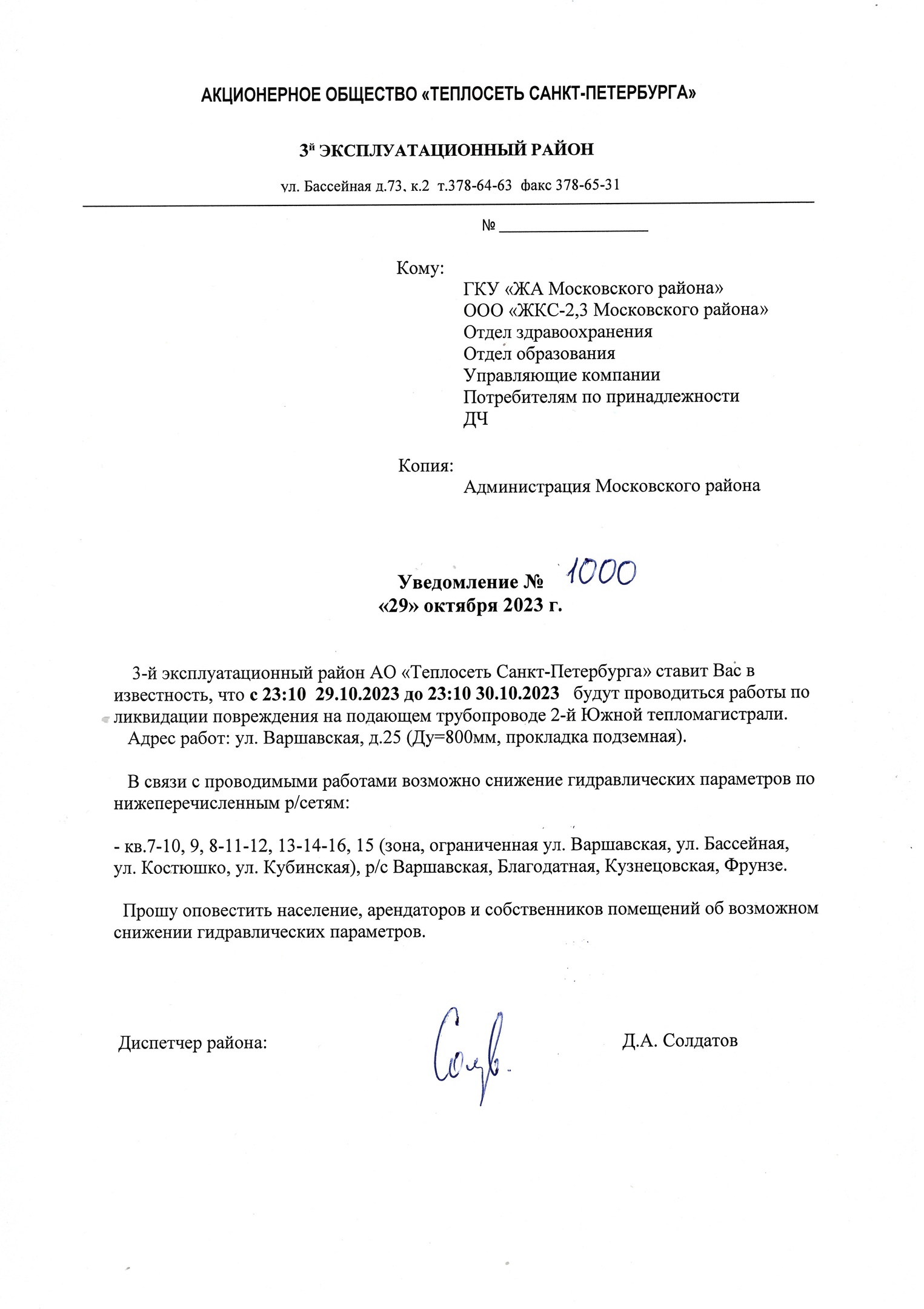 Третий эксплуатационный район АО "Теплосеть Санкт-Петербурга" ставит Вас в известность, с 23:00 29.10.2023 до 23:00 30.10.2023 будут проводиться работы по ликвидации повреждения на подающем трубопроводе 2-й Южной магистрали.
