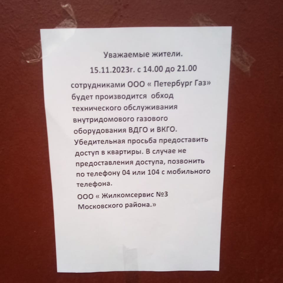 15.11.2023 c 14:00 до 21:00 представителями ООО "ПетербургГаз" будет осуществлён выход для проверки внутриквартирного газового оборудования многоквартирного дома по адресу: Московский проспект, д. 191