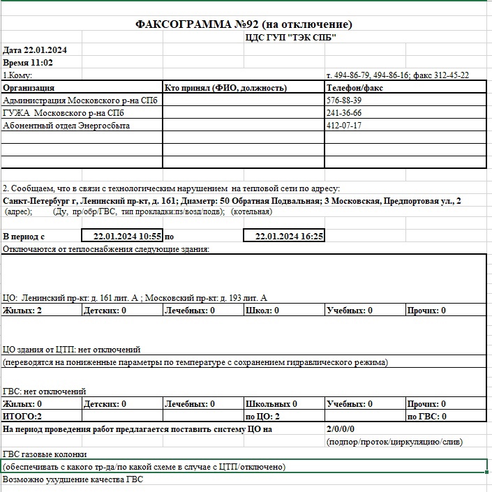 В связи с проводимыми работами с 10:55 22.01.2024 г. до 16:25 22.01.2024 г. возможно ограничение теплоснабжения по следующим адресам: Ленинский проспект, д. 161, Московский проспект, д. 193 лит. А
