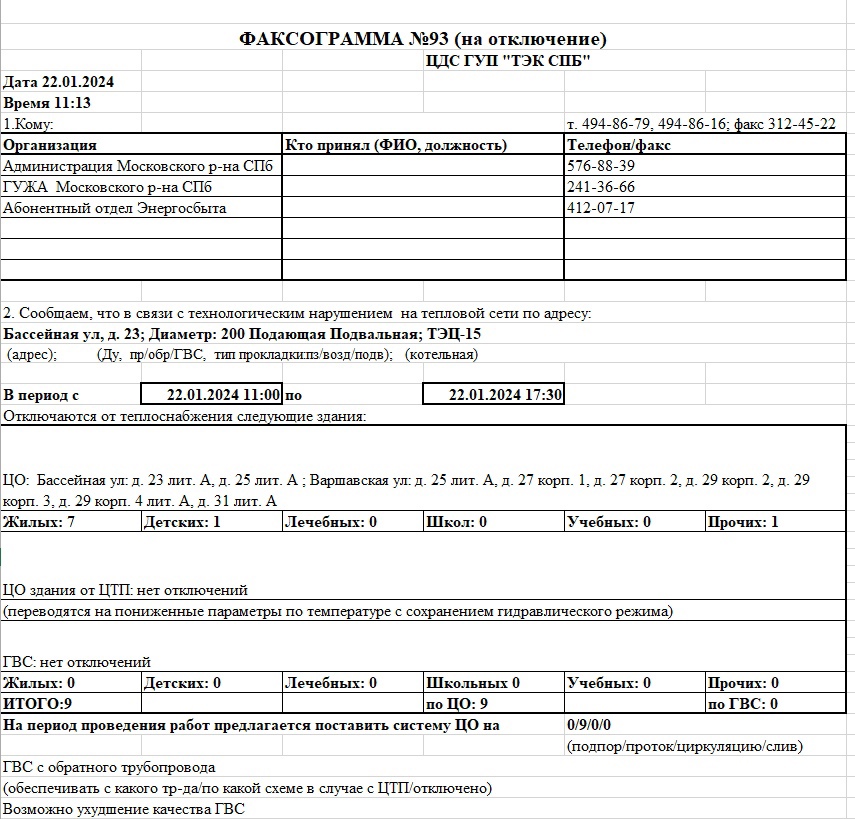 В связи с проводимыми работами с 11:00 22.01.2024 г. до 17:30 22.01.2024 г. возможно ограничение теплоснабжения по следующим адресам: ул. Бассейная д.23, д.25; ул. Варшавская д. 25, д.27 корп.1, д.27 корп.2, д.29 корп.2,3,4, д.31