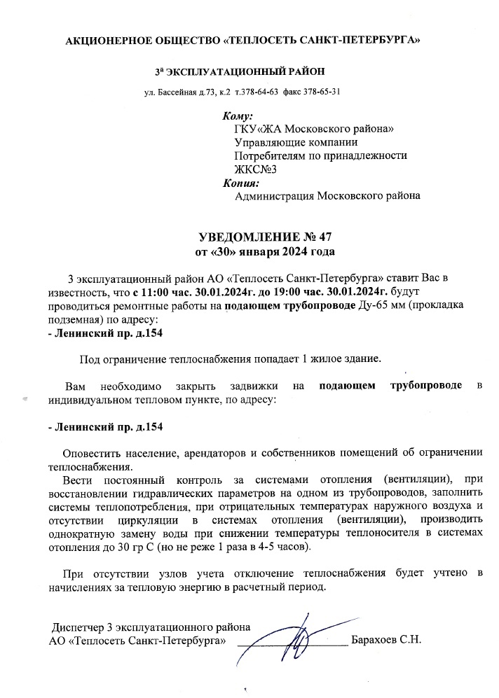 3-й эксплуатационный район АО "Теплосеть Санкт-Петербурга" ставит Вас в известность, с 11:00 часов 30.01.2024 до 19:00 30.01.2024 будут проводиться ремонтные работы на подающем трубопроводе по адресу: Ленинский проспект, д. 154