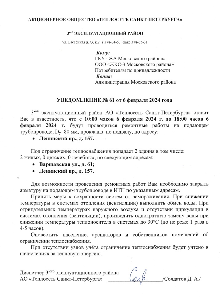 3-й эксплуатационный район АО "Теплосеть Санкт-Петербурга" ставит Вас в известность, с 10:00 часов 06.02.2024 до 18:00 06.02.2024 будут проводиться ремонтные работы на подающем трубопроводе по адресу: Ленинский проспект, д. 157