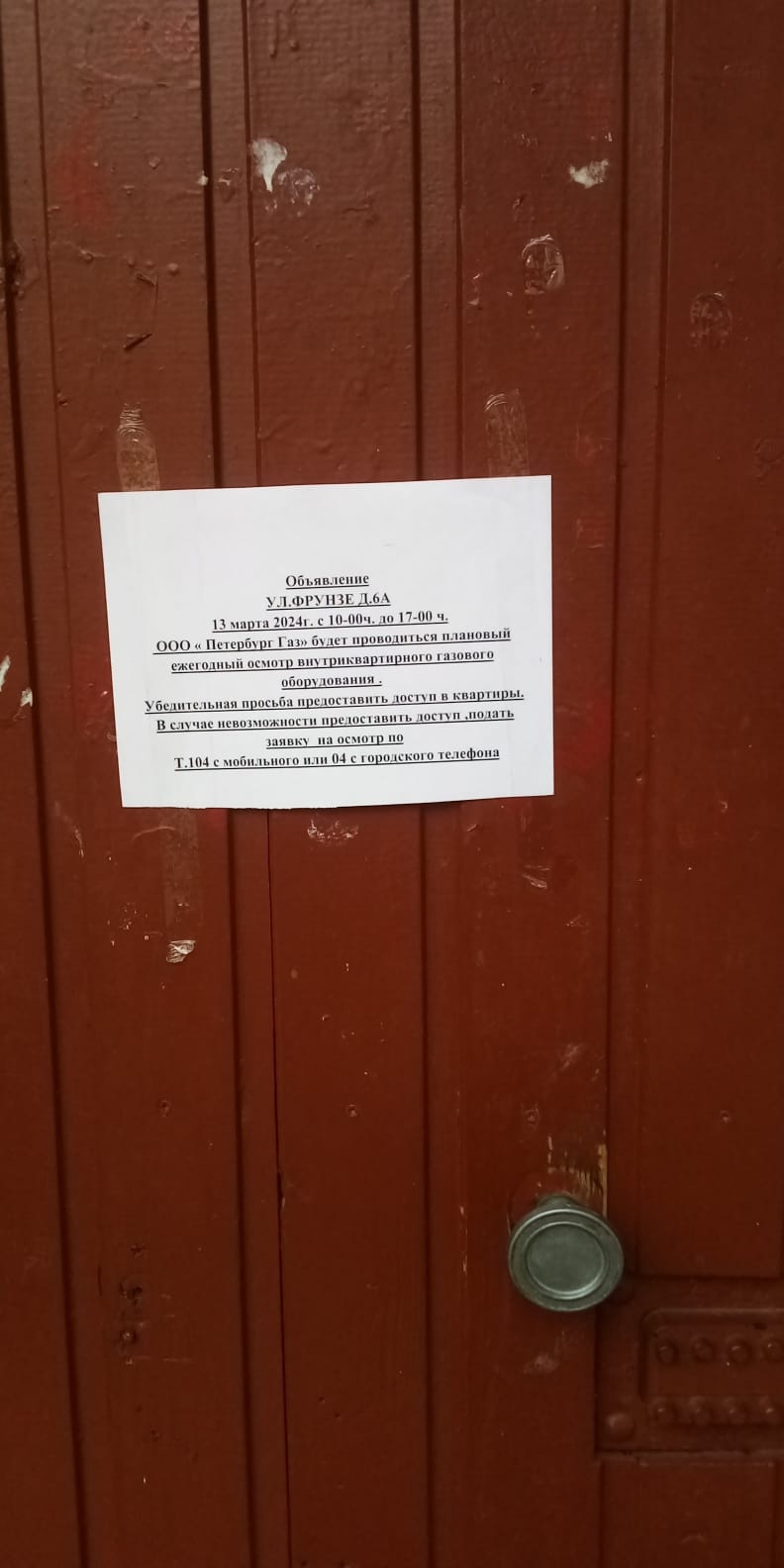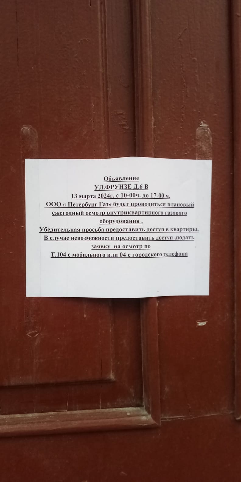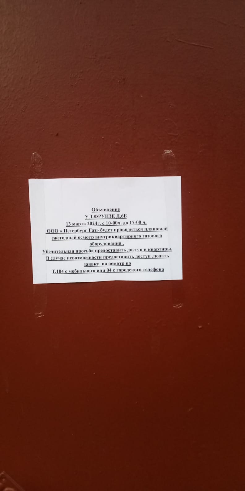 Информирование собственников о проверке внутридомового и внутриквартирного газового оборудования 13.03.2024 г. с 10:00 по 17:00 представителями ООО "ПетербургГаз" в многоквартирном доме по адресу: улица Фрунзе, д. 6