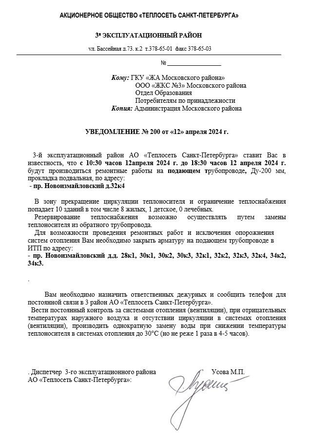 3-й эксплуатационный район АО «Теплосеть Санкт-Петербурга» ставит Вас в известность, что с 10:30 часов 12.04.2024 г. до 18:30 часов 12.04.2024 г. будут производиться ремонтные работы на подающем трубопроводе, Ду-200 мм, прокладка подвальная, по адресу: