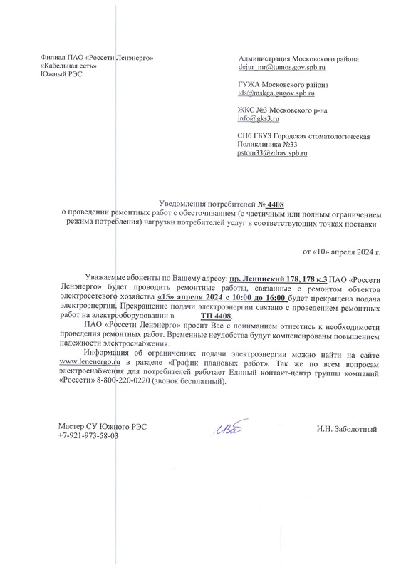 ПАО "Россети Ленэнерго" информирует о проведении ремонтных работ, связанных с ремонтом объекта электрического хозяйства с 10:00 час. 15.04.2024г. до 16:00 час 15.04.2024г. по адресам: Ленинский проспект, д. 178, д. 178 к. 3