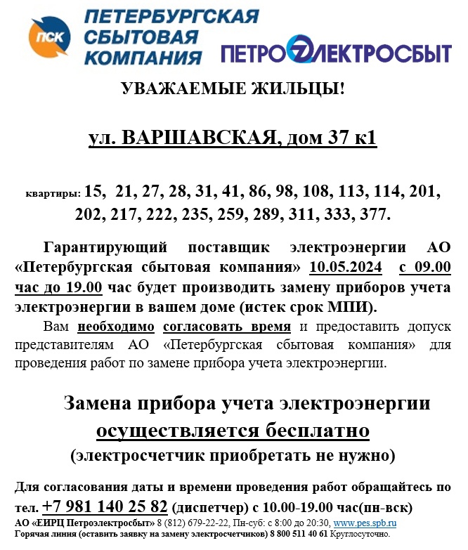 Гарантирующий поставщик электроэнергии АО «Петербургская сбытовая компания» 10.05.2024 с 09.00 час до 19.00 час будет производить замену приборов учета электроэнергии в вашем доме (истек срок МПИ).