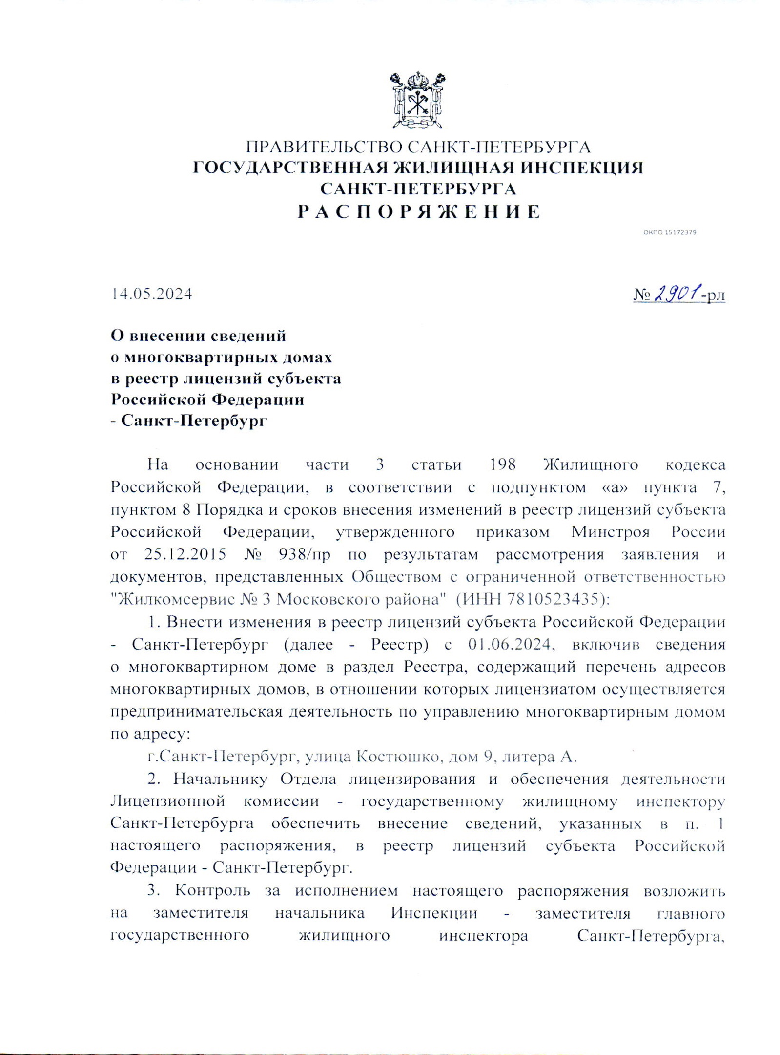 Распоряжение Государственной жилищной инспекции Санкт-Петербурга