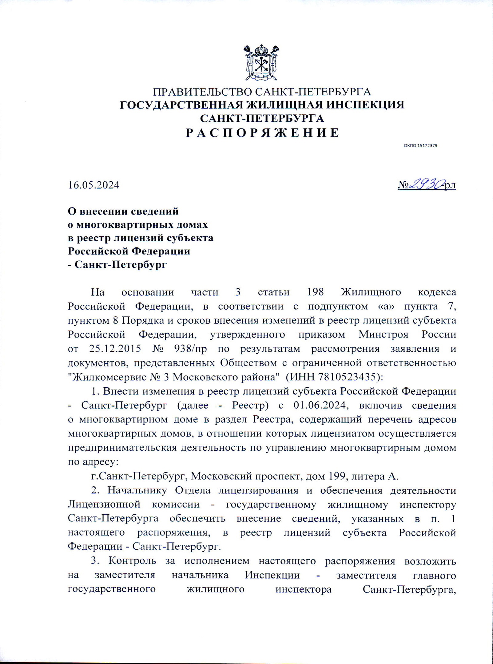 Распоряжение Государственной жилищной инспекции Санкт-Петербурга