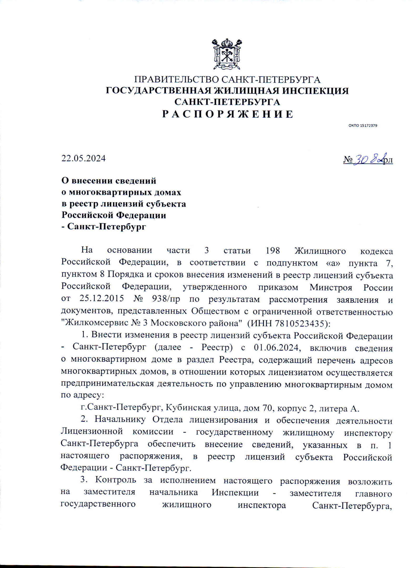 Распоряжение Государственной жилищной инспекции Санкт-Петербурга