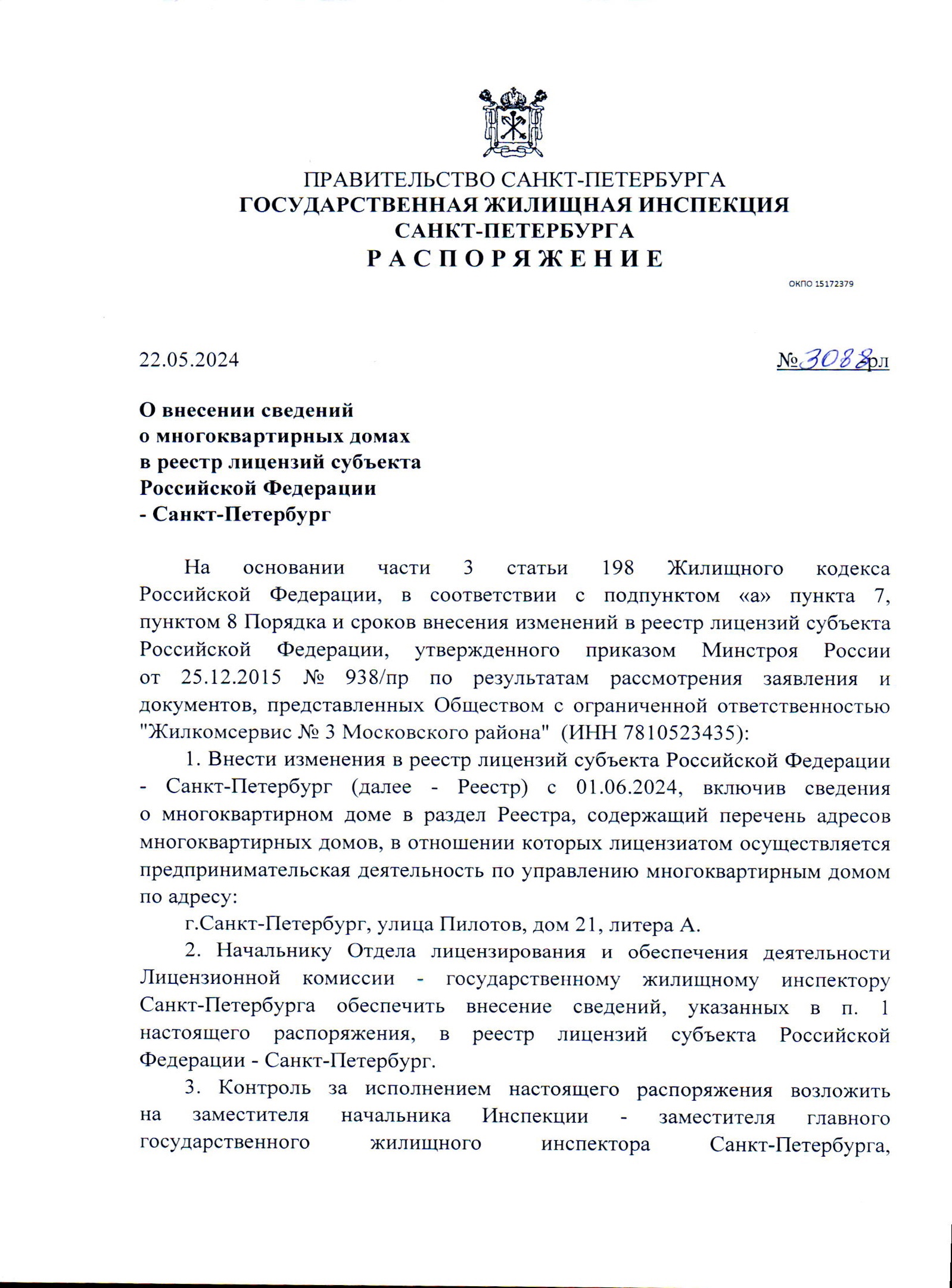 Распоряжение Государственной жилищной инспекции Санкт-Петербурга