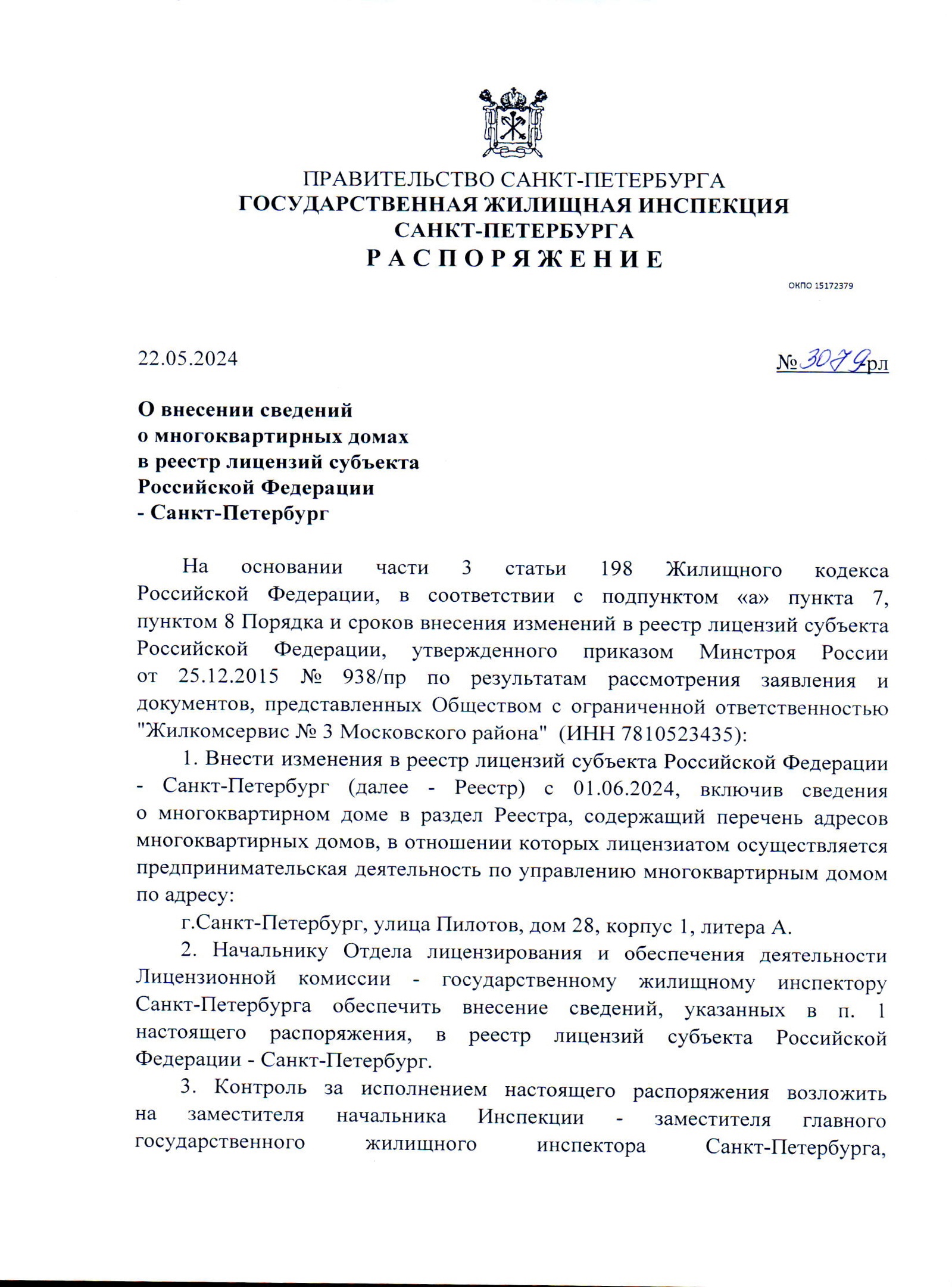 Распоряжение Государственной жилищной инспекции Санкт-Петербурга