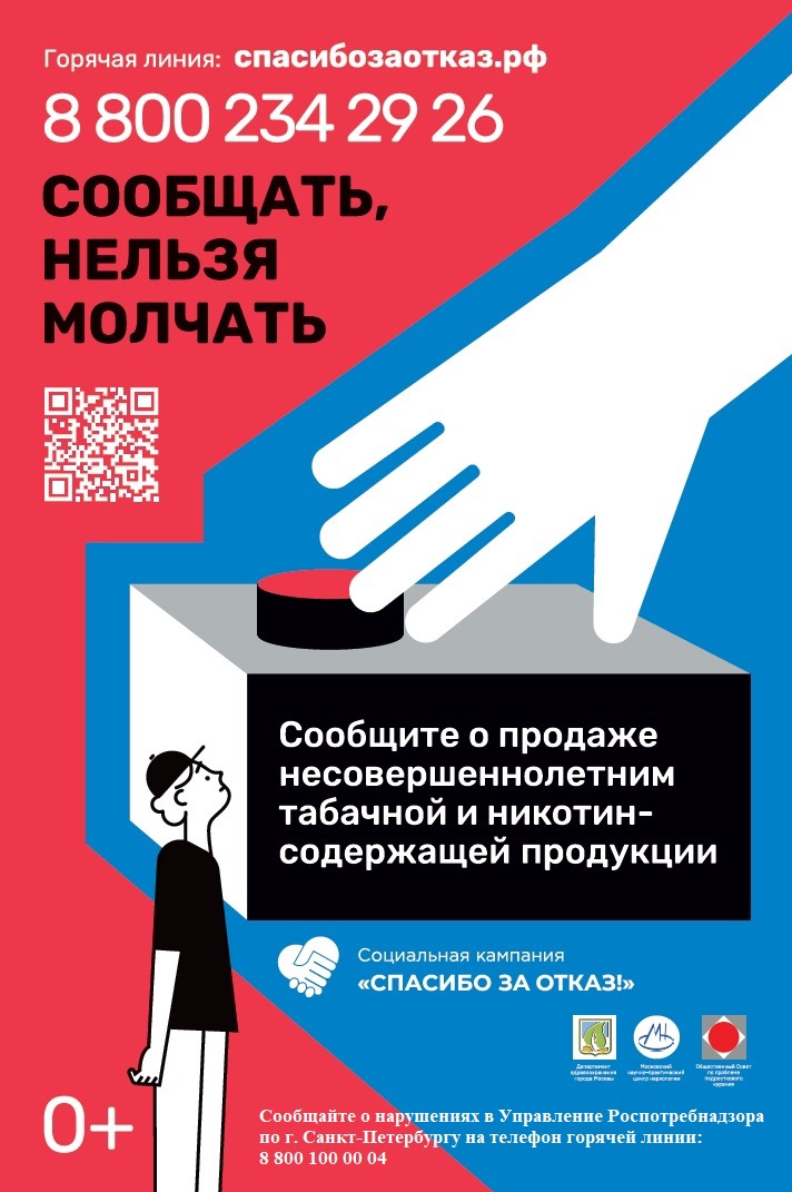 В целях снижения уровня доступности для несовершеннолетних табачной и никотинсодержащей продукции Общественный Совет проводит социальную кампанию «СПАСИБО ЗА ОТКАЗ!» (далее Социальная кампания). Социальная кампания включает в себя распространение информационных материалов для продавцов и покупателей в местах продаж сигарет и вейпов, усиление общественного контроля, а также размещение наружной рекламы. Кампания проходит при поддержки Правительства г. Санкт-Петербурга. Подробная информация о социальной кампании на сайте спасибозаотказ.рф