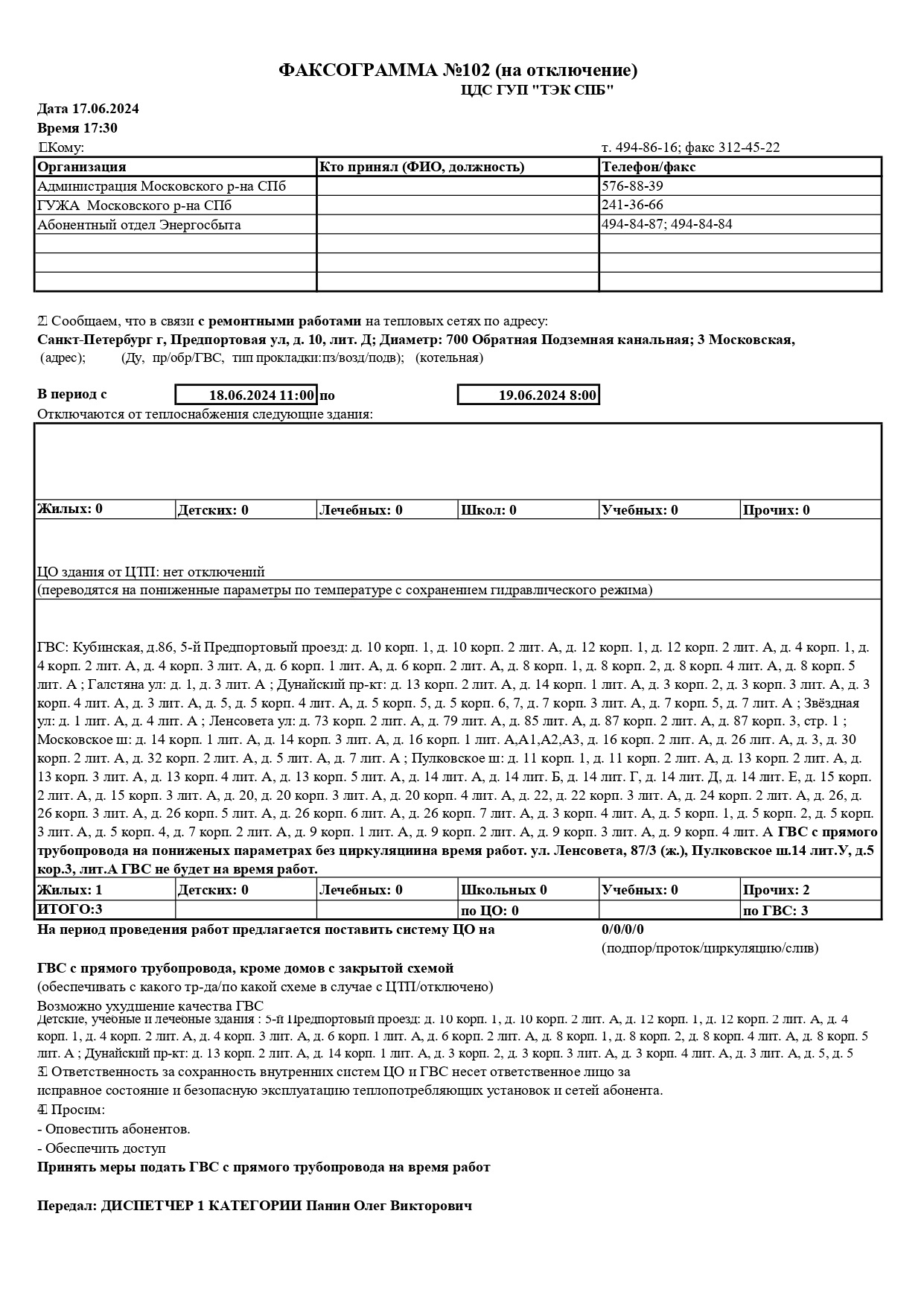 ЦДС ГУП "ТЭК СПБ" ставит Вас в известность об отключении теплоснабжения , с 11:00 18.06.2024 г. по 19.06.2024 г. в связи с ремонтными работами на тепловых сетях по адресу: Предпортовая ул, д. 10, лит. Д; Диаметр: 700 Обратная Подземная канальная; 3 Московская, Предпортовая ул., 2