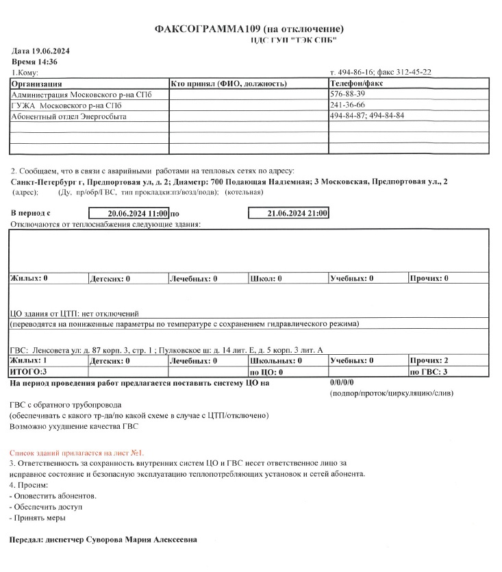 ЦДС ГУП "ТЭК СПБ" ставит Вас в известность об отключении теплоснабжения , с 11:00 20.06.2024 г. по 21:00 21.06.2024 г. в связи с аварийными работами на тепловых сетях по адресу: Предпортовая ул, д. 2