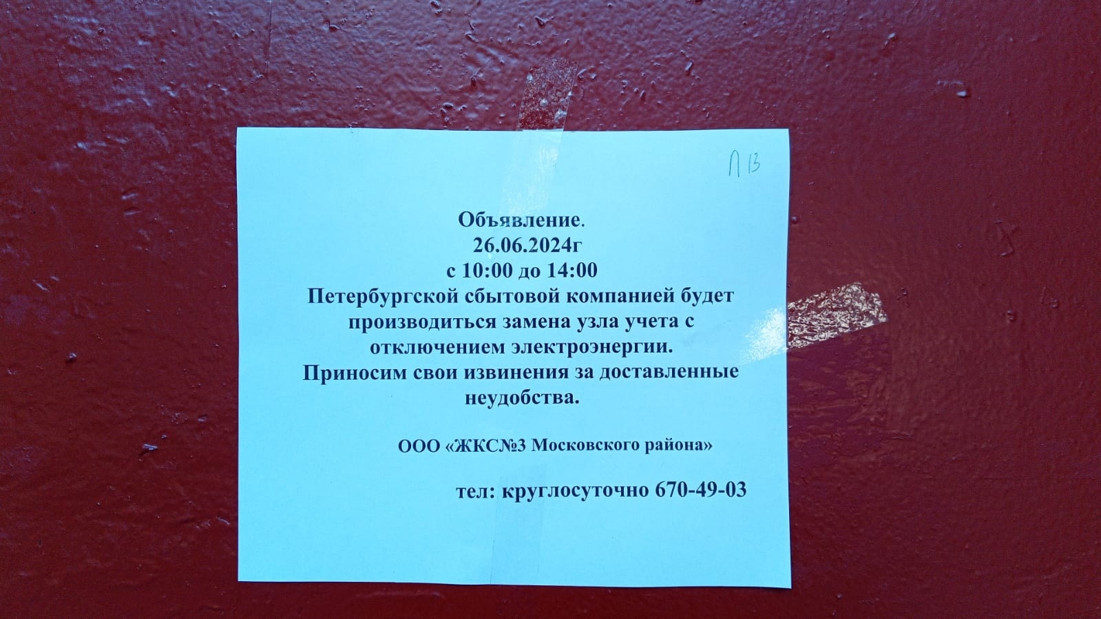Информирование собственников об отключении электроэнергии с 10:00 до 14:00 26.06.2024 г. в связи с работами АО «Петербургская сбытовая компания» по замене узлов учёта в многоквартирном доме по адресу: улица Победы, д. 13