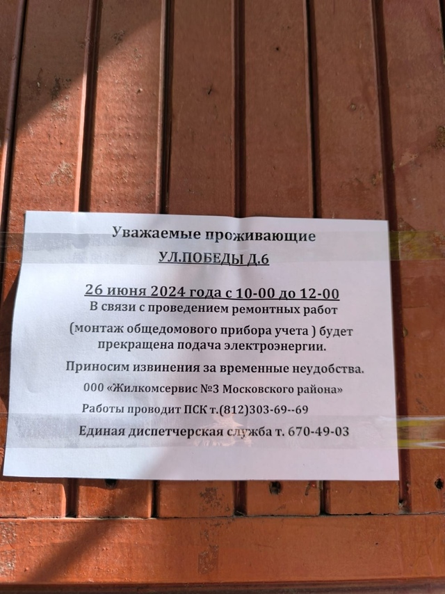 Информирование собственников об отключении электроэнергии с 10:00 до 12:00 26.06.2024 г. в связи с работами АО «Петербургская сбытовая компания» по замене узлов учёта в многоквартирном доме по адресу: улица Победы, д. 6