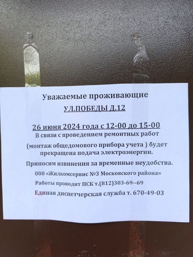 Информирование собственников об отключении электроэнергии с 12:00 до 15:00 26.06.2024 г. в связи с работами АО «Петербургская сбытовая компания» по замене узлов учёта в многоквартирном доме по адресу: улица Победы, д. 12
