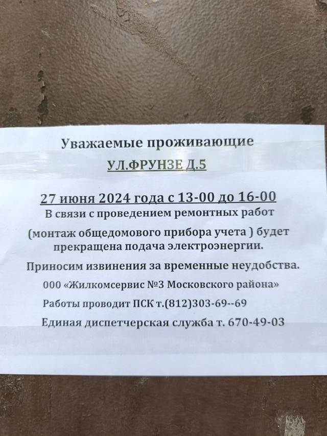 Информирование собственников об отключении электроэнергии с 13:00 до 16:00 27.06.2024 г. в связи с работами АО «Петербургская сбытовая компания» по замене узлов учёта в многоквартирном доме по адресу: улица Фрунзе, д. 5