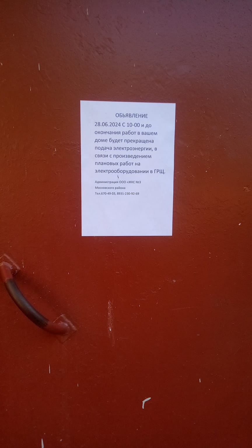 Информирование собственников об отключении электроэнергии с 10:00 до окончания работ 28.06.2024 г. в связи с работами АО «Петербургская сбытовая компания» по замене узлов учёта в многоквартирном доме по адресу: площадь Чернышевского, д. 9