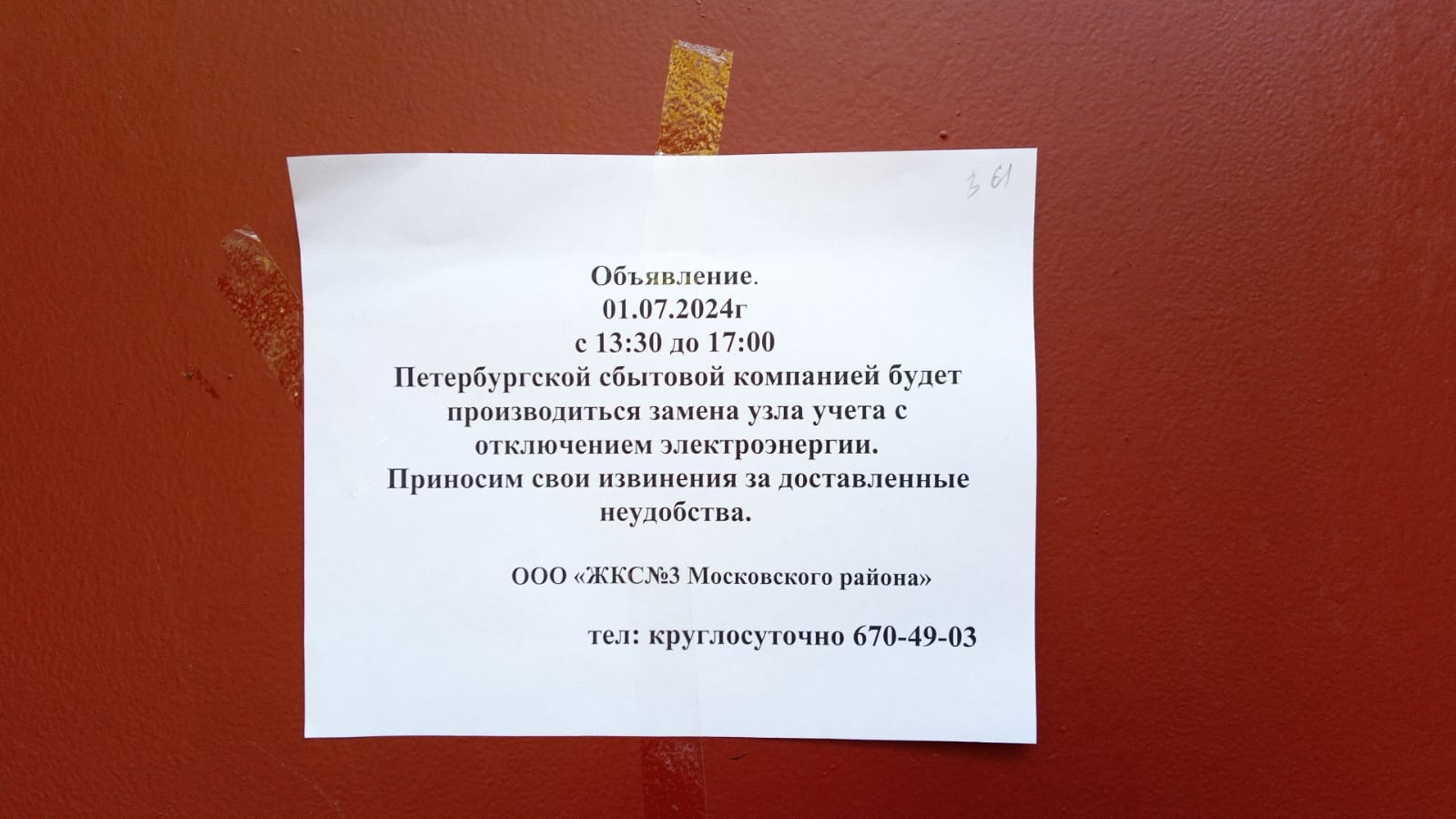 Информирование собственников об отключении электроэнергии с 13:30 до 17:00 01.07.2024 г. в связи с работами АО «Петербургская сбытовая компания» по замене узлов учёта в многоквартирном доме по адресу: Варшавская улица, д. 61