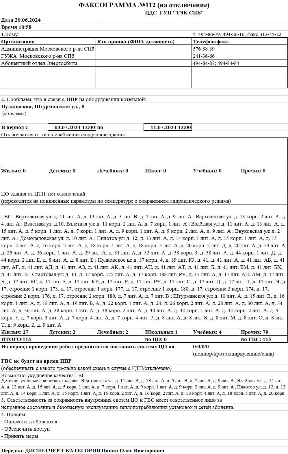 ЦДС ГУП "ТЭК СПБ" ставит Вас в известность об отключении ГВС, с 12:00 03.07.2024 г. по 12:00 11.07.2024 г. в связи с ППР работами на оборудовании котельной по адресу: Штурманская ул., д. 8