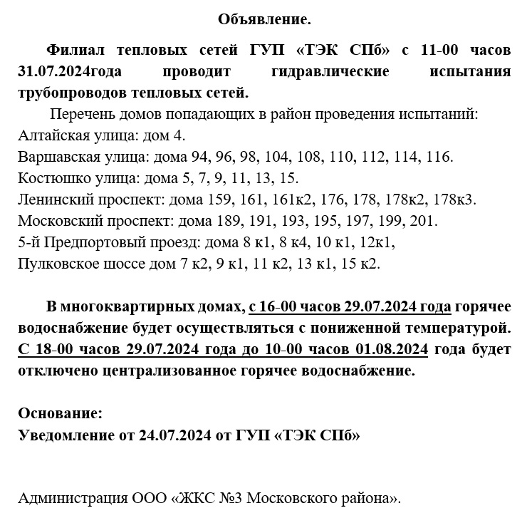 Филиал тепловых сетей ГУП «ТЭК СПб» с 11-00 часов 31.07.2024 года проводит гидравлические испытания трубопроводов тепловых сетей.