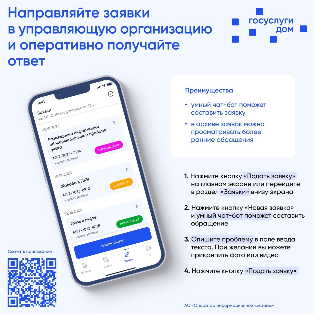 Информируем Вас о том, что Вы можете подавать заявки в управляющую организацию в мобильном приложении Госуслуги.Дом