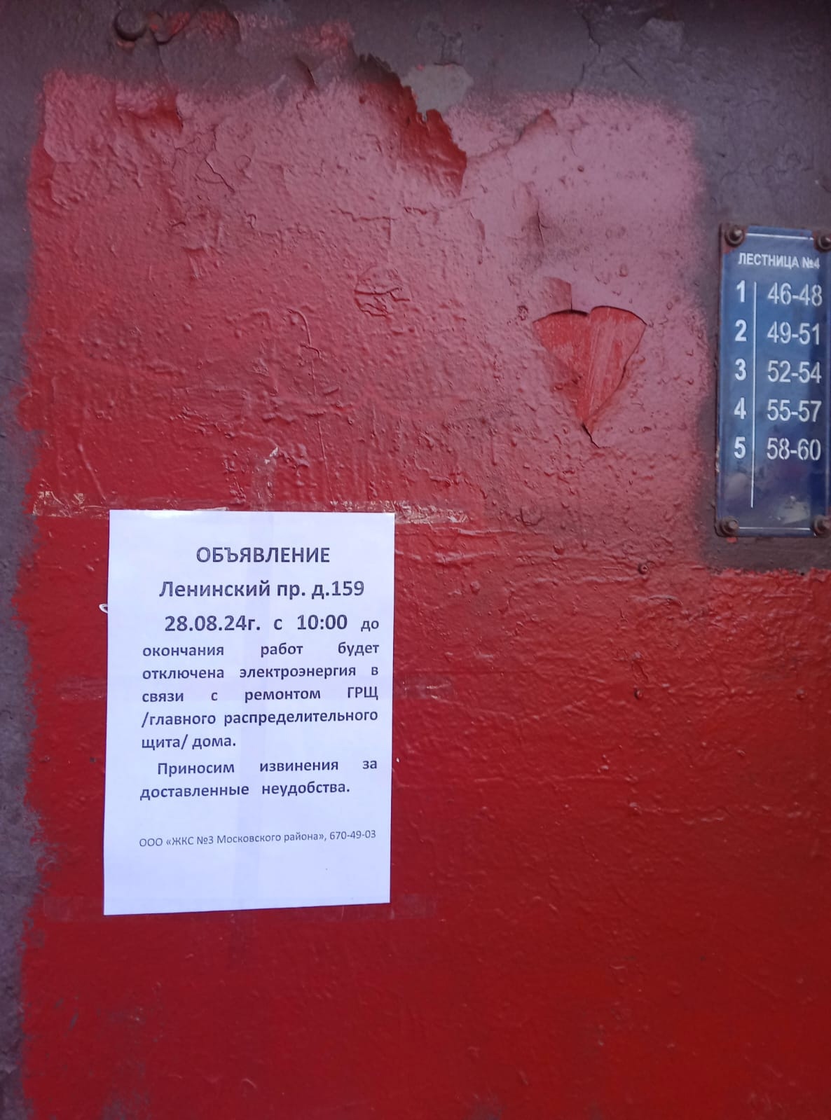 Информирование собственников об отключении электроэнергии с 10:00 28.08.2024 г. до окончания работ в связи с ремонтом ГРЩ в многоквартирном доме по адресу: Ленинский проспект, д. 159