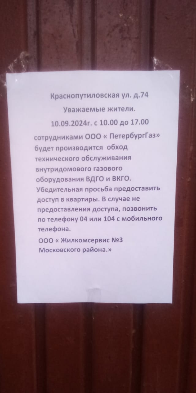 Информирование собственников о необходимости предоставления доступа в квартиры для проверки внутридомового и внутриквартирного газового оборудования представителями ООО "ПетербургГаз" в многоквартирном доме по адресу: Краснопутиловская улица, д. 74