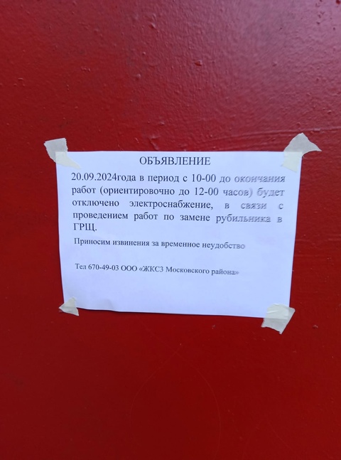Информирование собственников об отключении электроэнергии с 10:00 до 12:00 20.09.2024 г. в связи с проведением работ по замене рубильника в ГРЩ многоквартирного дома по адресу: Варшавская улица, д. 49