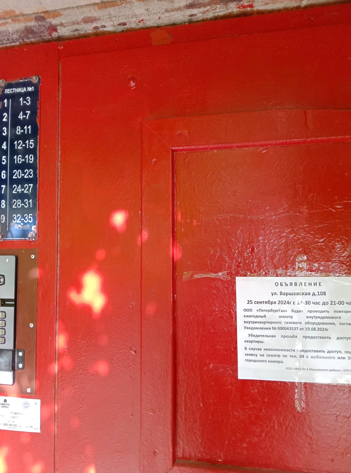 Информирование собственников о необходимости предоставления доступа в квартиры для проверки внутридомового и внутриквартирного газового оборудования представителями ООО "ПетербургГаз" в многоквартирном доме по адресу: Варшавская улица, д. 108