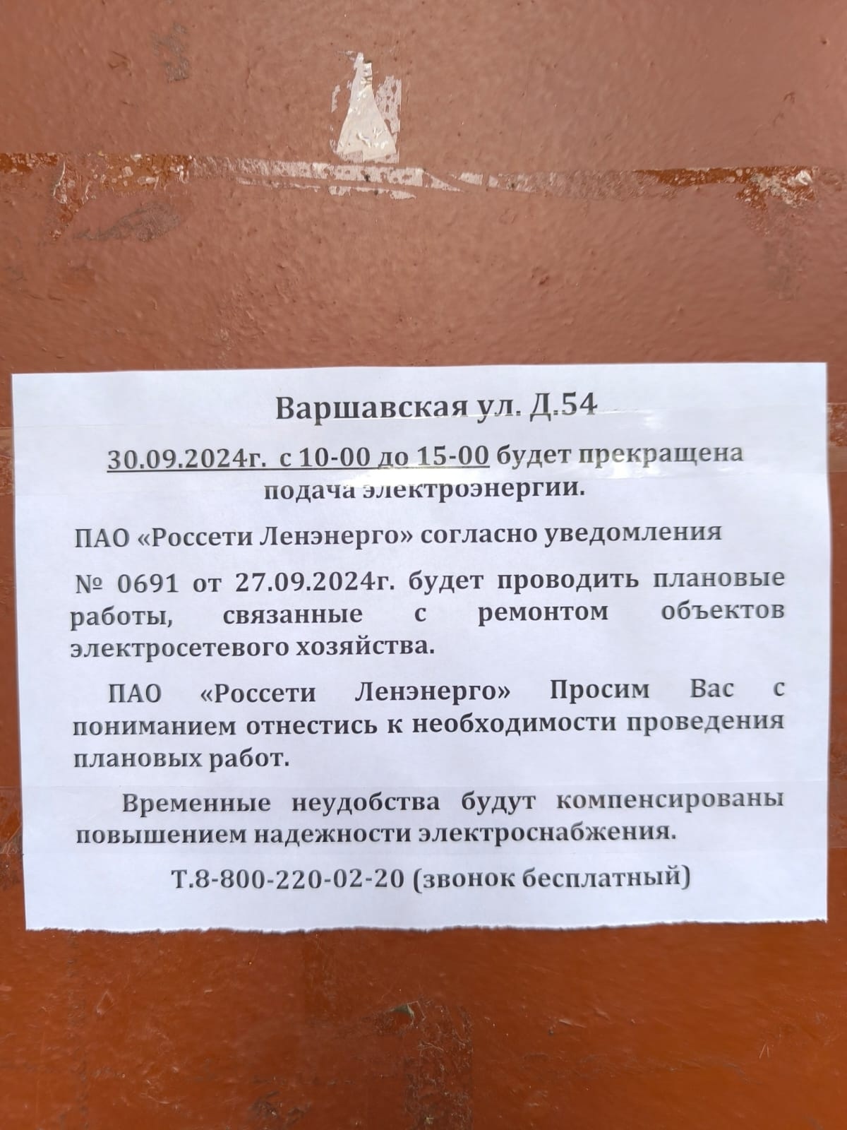 Информирование собственников об отключении электроэнергии с 10:00 до 15:00 30.09.2024 г. в связи с работами ПАО «Россети Ленэнерго» по ремонту объектов электросетевого хозяйства в многоквартирном доме по адресу: Варшавская улица, д. 54