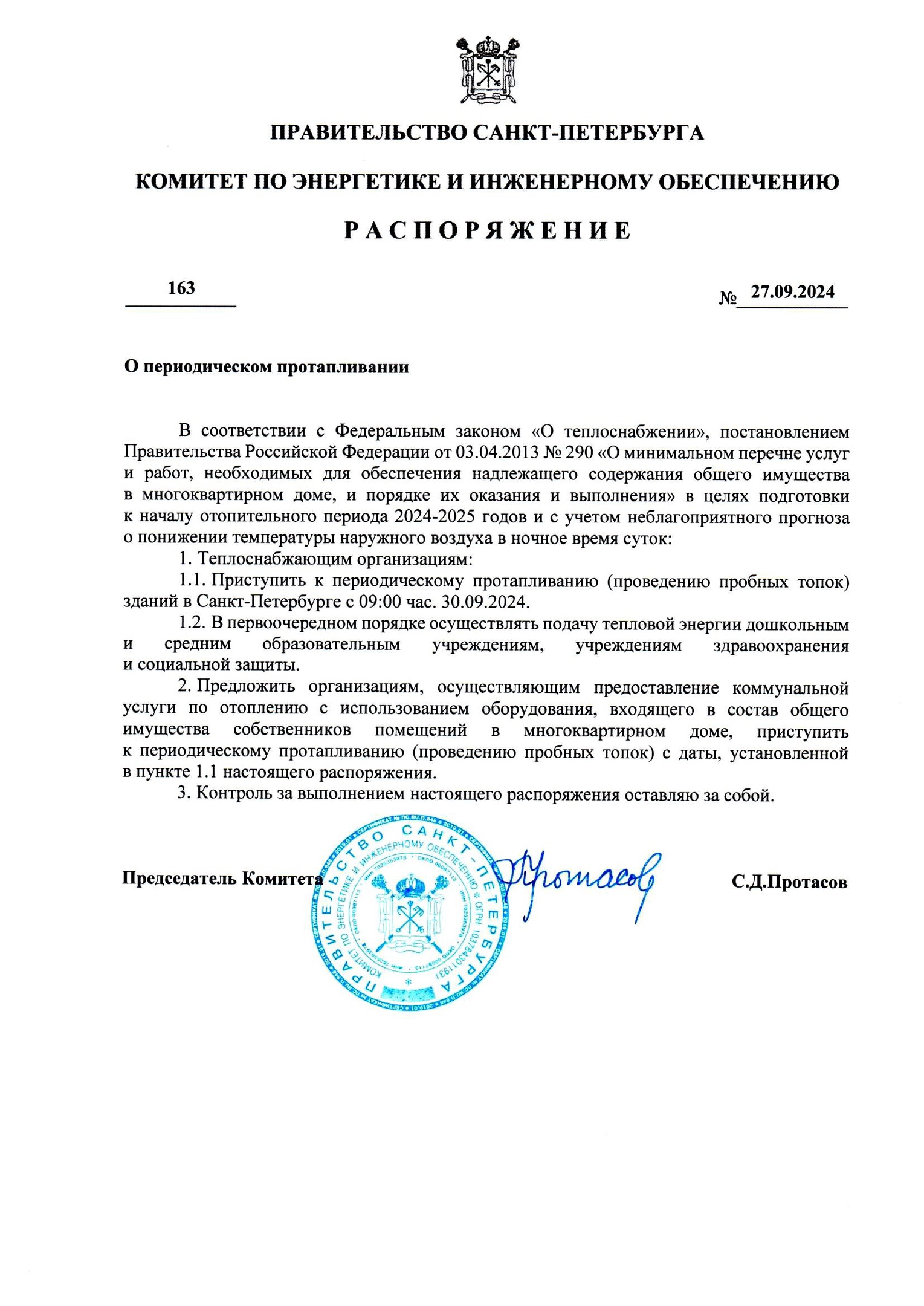 В связи с прогнозируемым снижением ночных температур по поручению Губернатора Александра Беглова с 9.00 часов 30 сентября в Санкт‑Петербурге начинается периодическое протапливание. Подписано соответствующее распоряжение Комитета по энергетике и инженерному обеспечению № 163 от 27.09.2024.