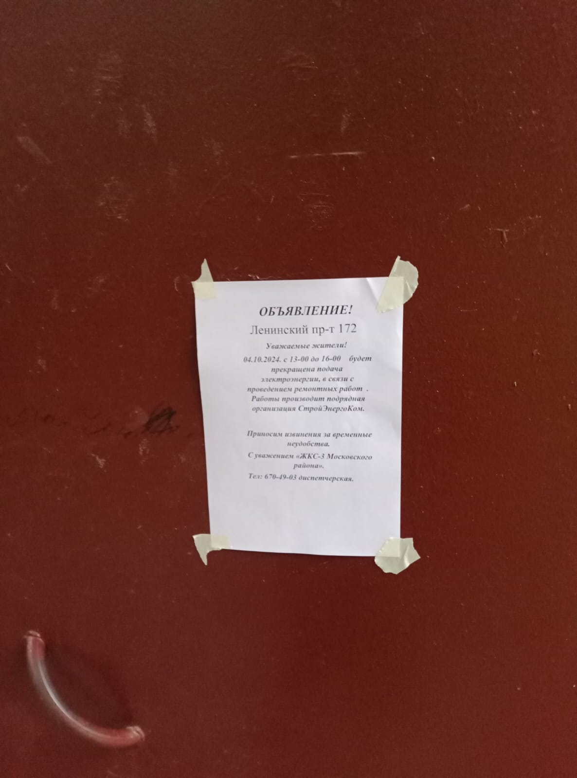 Информирование собственников об отключении электроэнергии с 13:00 до 16:00 04.10.2024 г. в связи с проведением ремонтных работ в многоквартирном доме по адресу: Ленинский проспект, д. 172