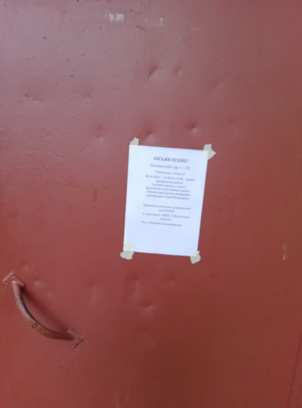 Информирование собственников об отключении электроэнергии с 12:00 до 15:00 04.10.2024 г. в связи с проведением ремонтных работ в многоквартирном доме по адресу: Ленинский проспект, д. 170