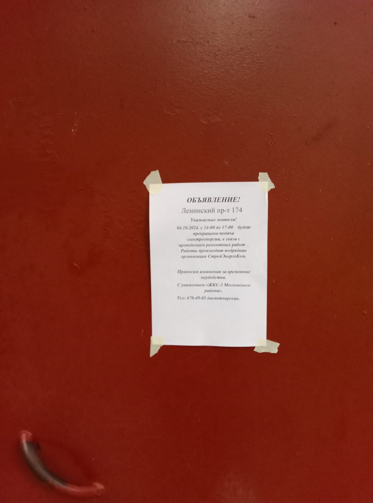 Информирование собственников об отключении электроэнергии с 14:00 до 17:00 04.10.2024 г. в связи с проведением ремонтных работ в многоквартирном доме по адресу: Ленинский проспект, д. 174