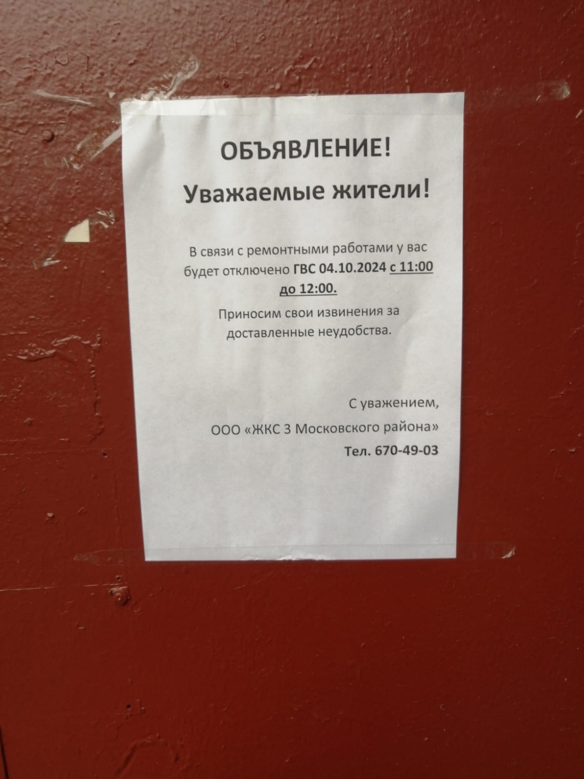 Информирование собственников об отключении ГВС с 11:00 до 12:00 04.10.2024 г. в связи с проведением ремонтных работ в многоквартирном доме по адресу: Пулковское шоссе, д. 15, к. 2
