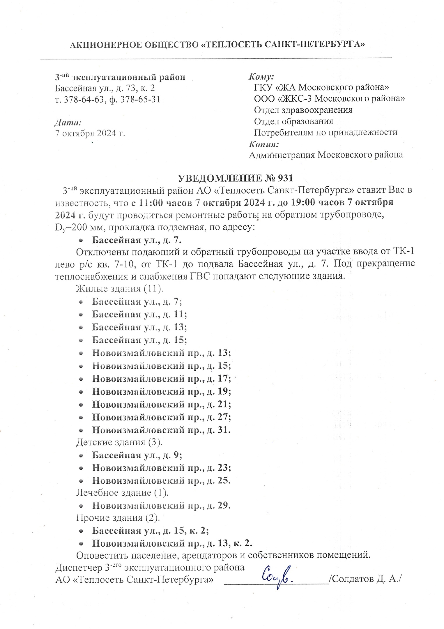 3-й эксплуатационный район АО "Теплосеть Санкт-Петербурга" ставит Вас в известность, с 11 часов до 19 часов 07.10.2024 г. будут проводиться ремонтные работы на обратном трубопроводе по адресу: Бассейная улица дом 7. В связи с проводимыми работами под прекращение теплоснабжения и снабжения ГВС попадают следующие адреса: