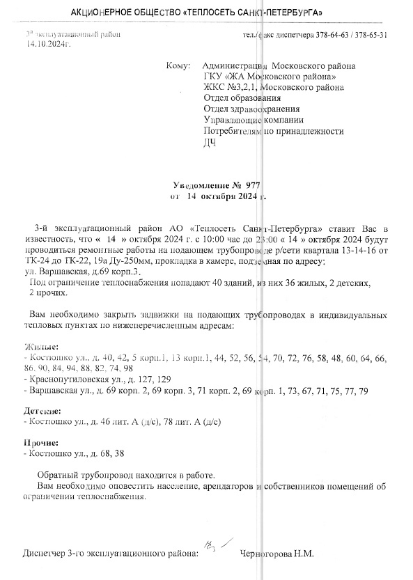 3-й эксплуатационный район АО "Теплосеть Санкт-Петербурга" ставит Вас в известность, с 10 часов до 23 часов 14.10.2024 будут проводиться ремонтные работы на подающем трубопроводе по адресу: Варшавская улица, дом 69, корп. 3. В связи с проводимыми работами под отключение теплоснабжения попадают 40 зданий.