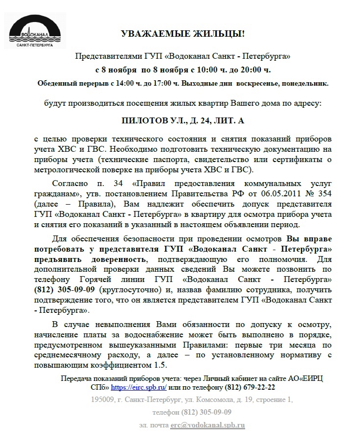 учета ХВС и ГВС с 10:00 до 20:00 08.11.2024 г. в помещениях многоквартирного дома по адресу: улица Пилотов, д. 24, лит. А