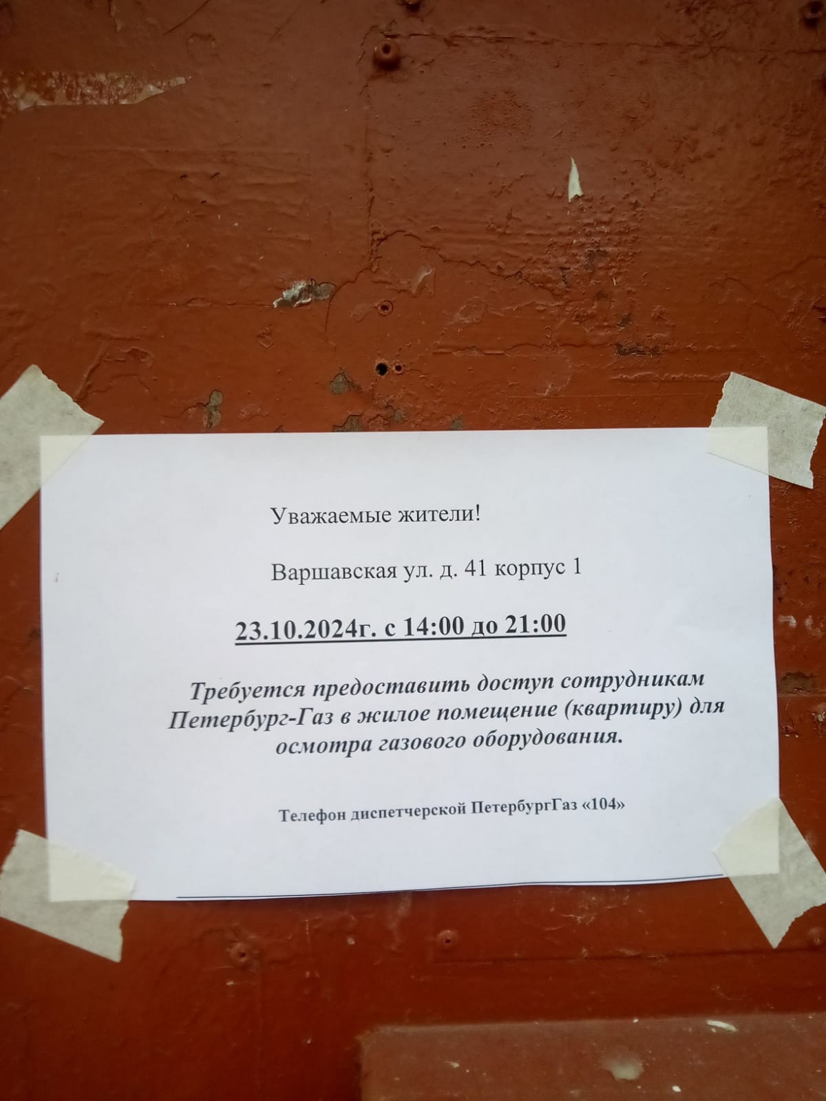 Информирование собственников о необходимости предоставления доступа в квартиры для проверки внутридомового и внутриквартирного газового оборудования сотрудниками ООО "ПетербургГаз" в многоквартирном доме по адресу: Варшавская улица, д. 41, к. 1