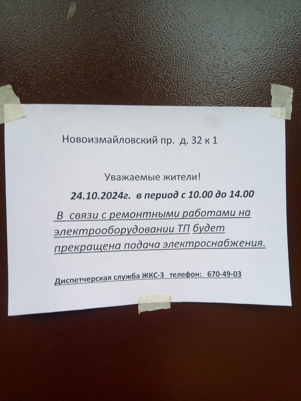 Информирование собственников об отключении электроэнергии с 10:00 до 14:00 24.10.2024 г. в связи с ремонтными работами на ТП многоквартирного дома по адресу: Новоизмайловский проспект, д. 32, к. 1