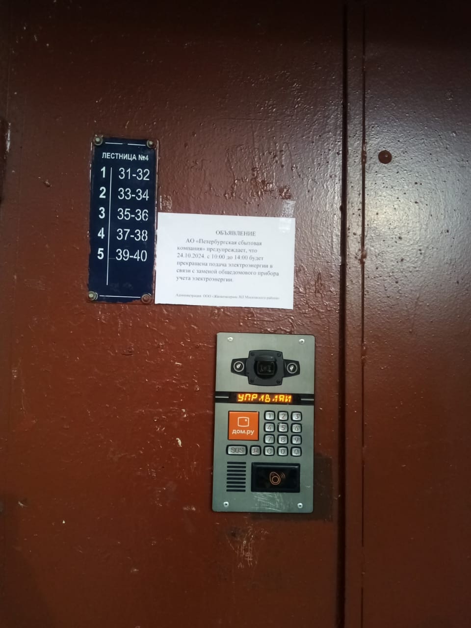 Информирование собственников об отключении электроэнергии с 10:00 до 14:00 24.10.2024 г. в связи с работами АО "Петербургская сбытовая компания" по замене прибора учёта в ГРЩ многоквартирного дома по адресу: Краснопутиловская улица, д. 79