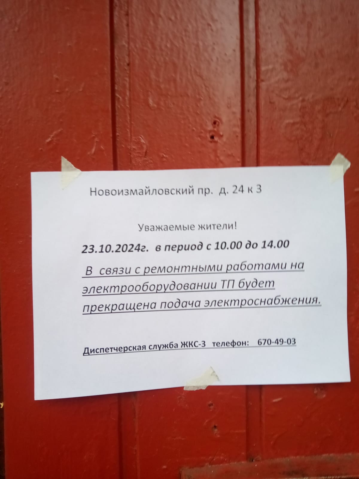 Информирование собственников об отключении электроэнергии с 10:00 до 14:00 23.10.2024 г. в связи с ремонтными работами на ТП многоквартирного дома по адресу: Новоизмайловский проспект, д. 24, к. 3