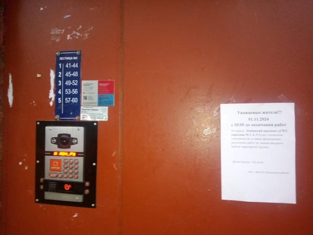 Информирование собственников об отключении электроэнергии с 10:00 до окончания работ 01.11.2024 г. в связи с ремонтными работами на ГРЩ многоквартирного дома по адресу: Ленинский проспект, д. 178, к. 2