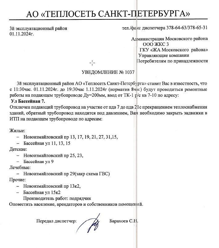 3-й эксплуатационный район АО "Теплосеть Санкт-Петербурга" ставит Вас в известность, с 11:30 до 19:30 01.11.2024 г. будут проводиться ремонтные работы на подающем трубопроводе по адресу: Бассейная улица, д. 7