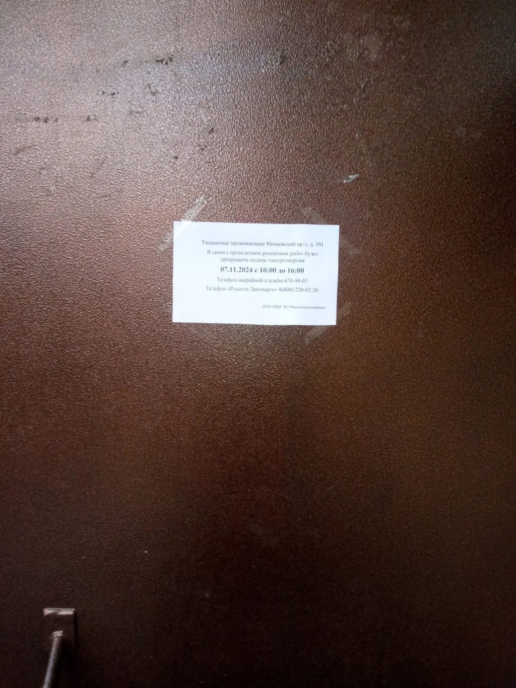 Информирование собственников об отключении электроэнергии с 10:00 до 16:00 07.11.2024 г. в связи с ремонтными работами на ГРЩ многоквартирного дома по адресу: Московский проспект, д. 191