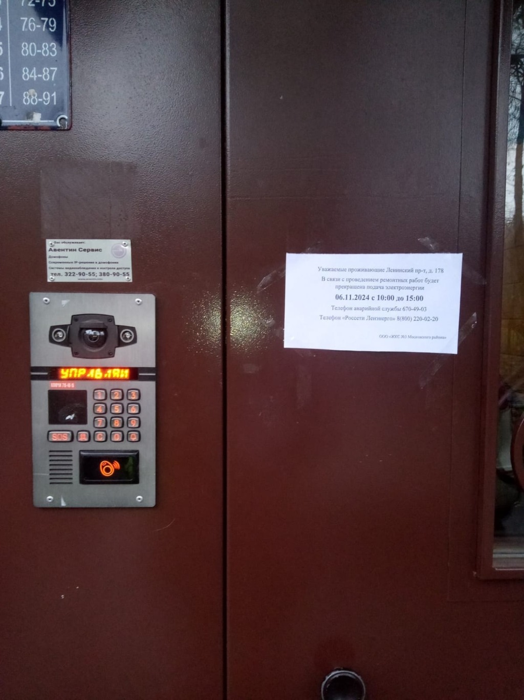 Информирование собственников об отключении электроэнергии с 10:00 до 15:00 06.11.2024 г. в связи с ремонтными работами на ГРЩ многоквартирного дома по адресу: Ленинский проспект, д. 178