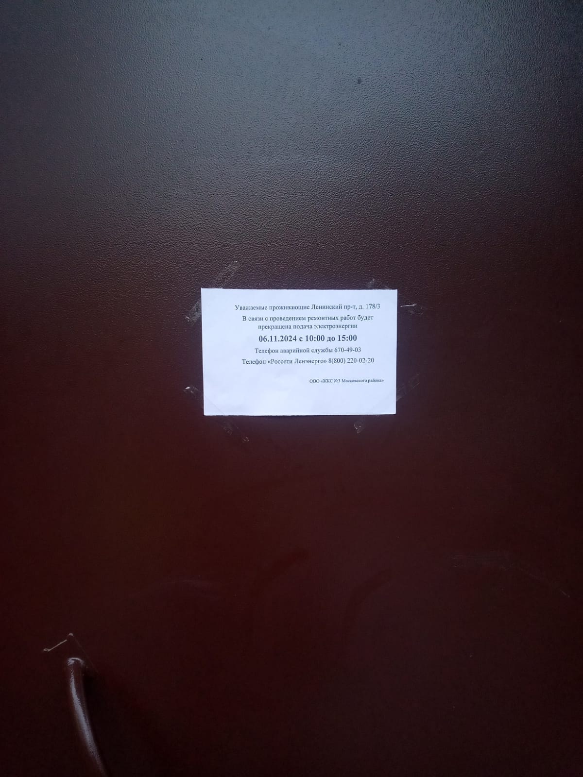 Информирование собственников об отключении электроэнергии с 10:00 до 15:00 06.11.2024 г. в связи с ремонтными работами на ГРЩ многоквартирного дома по адресу: Ленинский проспект, д. 178, к. 3